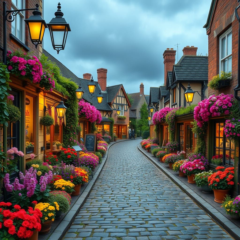 This enchanting image depicts a quaint cobblestone street lined with vibrant flower gardens and charming storefronts, bathed in the soft glow of vintage street lamps, with an artistic style reminiscent of classic children's book illustrations.