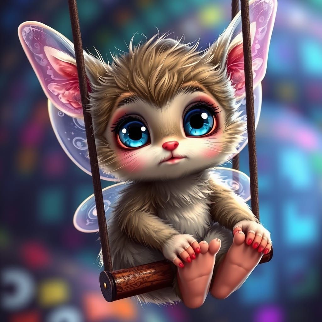 This captivating image features a hyperrealistic fairy sitting on a swing, surrounded by a colorful background. Her large, expressive eyes sparkle with curiosity, and her fur is meticulously rendered in intricate detail. The illustration blends hyperrealism with whimsy, reminiscent of splash art and conc...