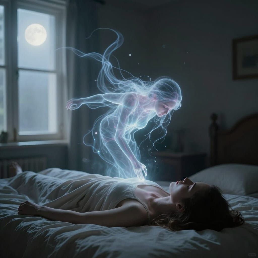 This image depicts a person's consciousness as a glowing, spectral form hovering above their physical body. The scene is set in a dimly lit room, rendered with photographic realism and a cool color palette.