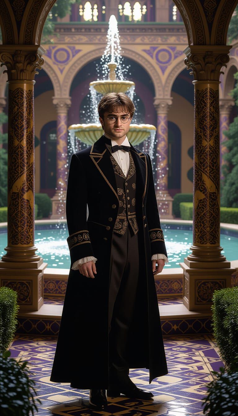 A cinematic image shows a figure in elegant attire within a mystical garden. Ornate pillars and a grand fountain are prominent, with purple and yellow complementary colors creating a dark fantasy aesthetic.