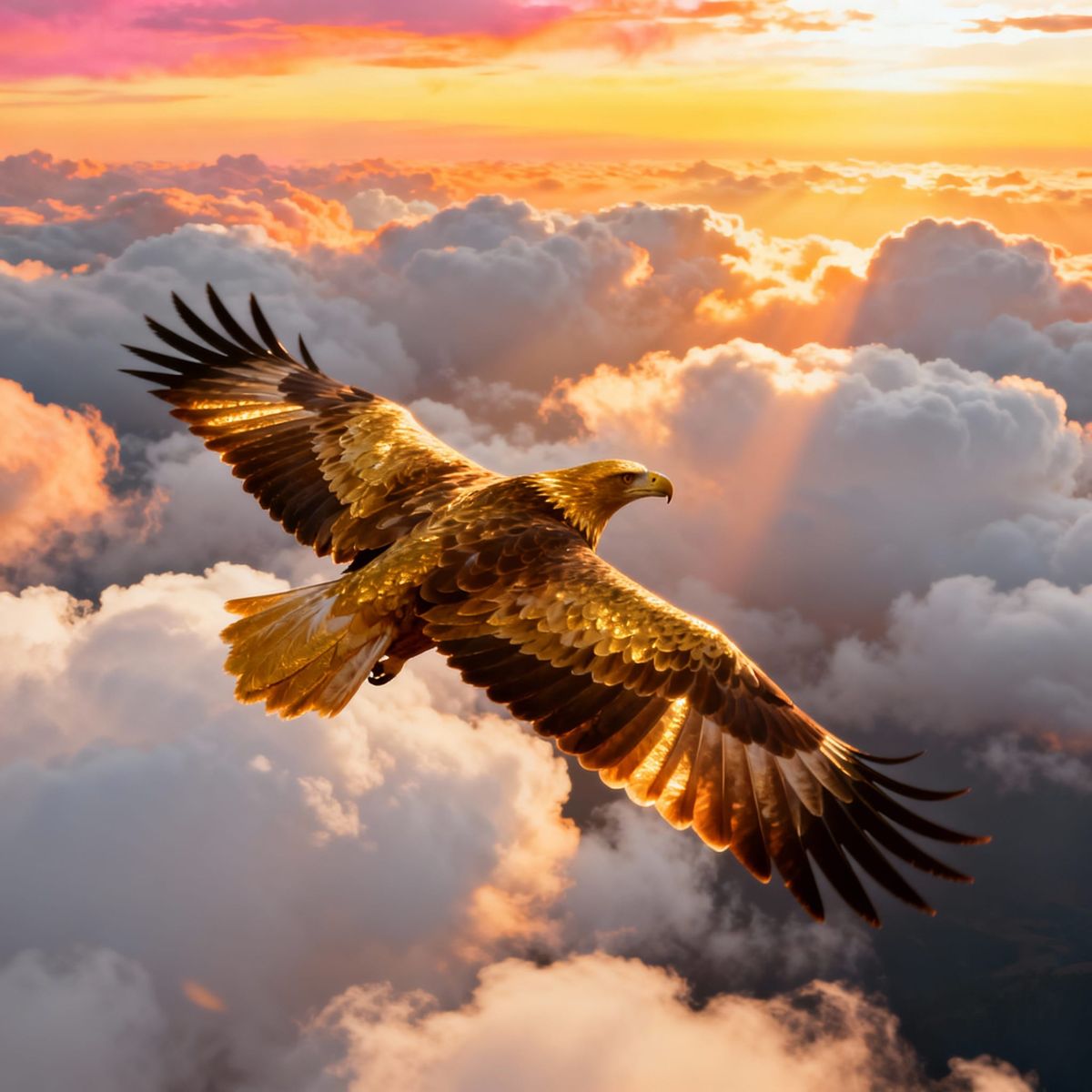 This photorealistic image captures a majestic golden eagle in flight above clouds during golden hour. The eagle's wings are illuminated by warm light, creating a dramatic and vibrant scene.