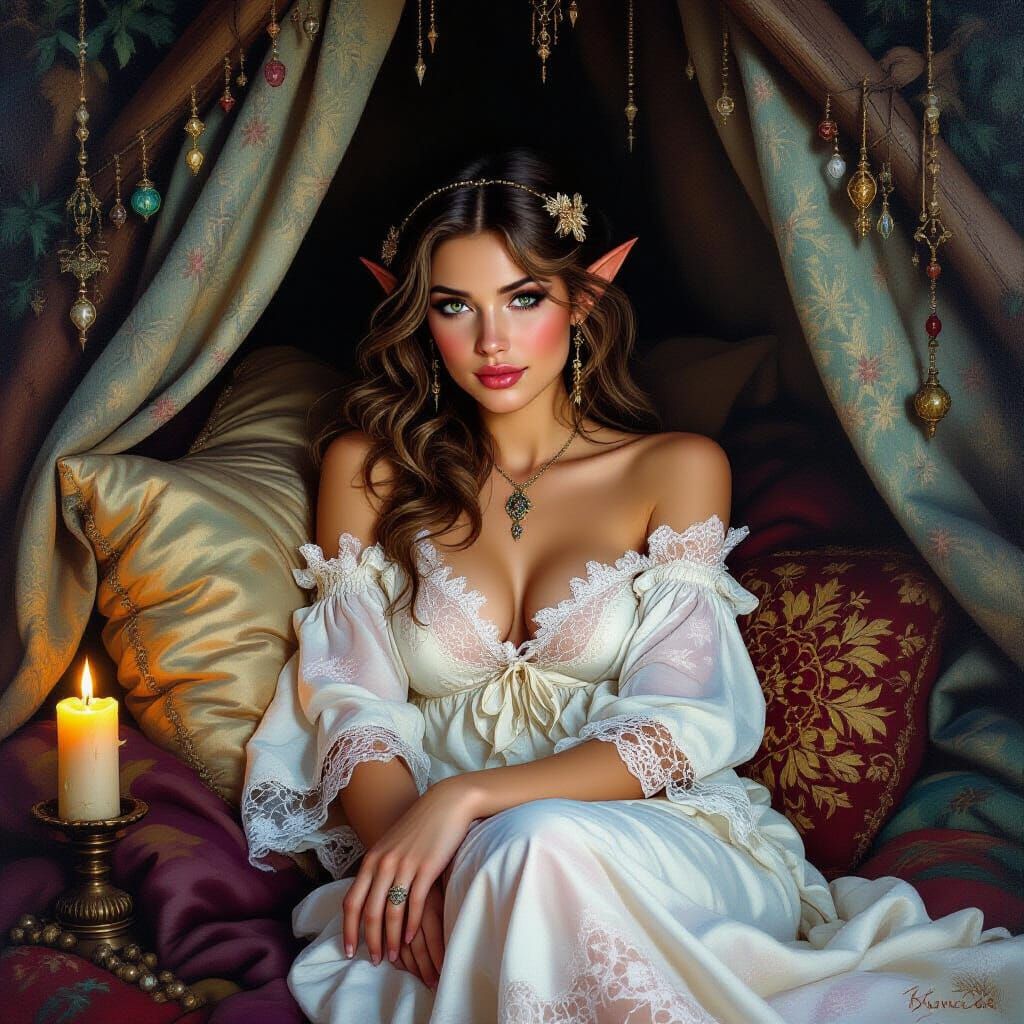 A fantasy oil painting of an elf woman wearing a nightgown inside a pillow fort. The scene is illuminated by candlelight and features intricate fabrics and mystical objects.