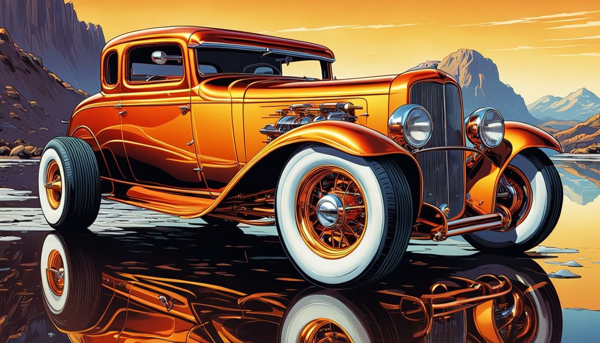 A vibrant comic book illustration of a vintage hot rod with whitewall tires. The close-up shot emphasizes the car's chrome details and luminescent paint job in a retro style.