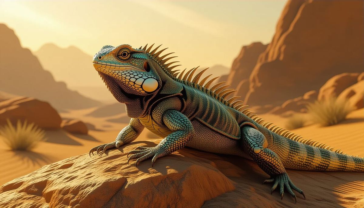 A striking picture of a desert lizard adorned with ornate armor, basking on sun-baked rock. The image blends dark fantasy themes with hyper-realistic detail, rendered with volumetric lighting in warm yellow tones.