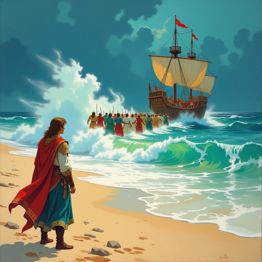 A prince observes thirty-three legendary warriors rising from a stormy sea, accompanied by Chernomor. The scene is richly detailed with vibrant colors, reminiscent of classic Russian epic art.