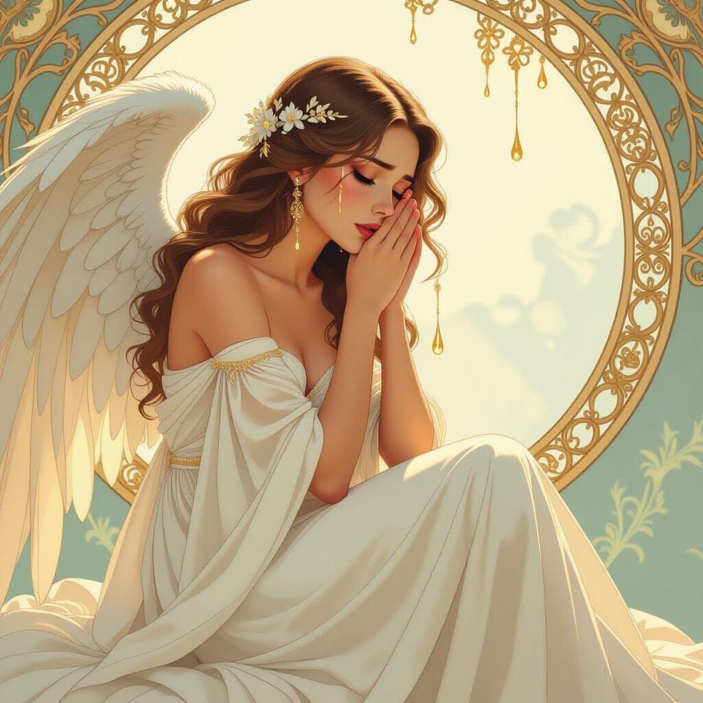A beautiful angel in a flowing white gown sheds golden tears against a serene backdrop. The image is rendered in an art nouveau style with intricate details and an ethereal glow.