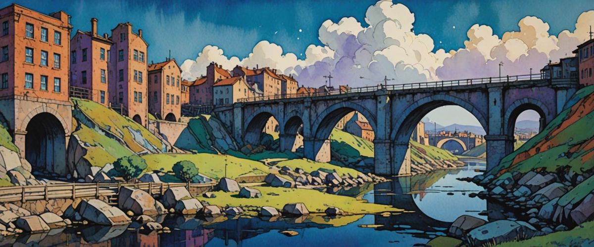 This image shows a factory district in a gritty industrial wasteland under a bright blue sky. The art style is reminiscent of impressionist watercolor and gouache paintings.