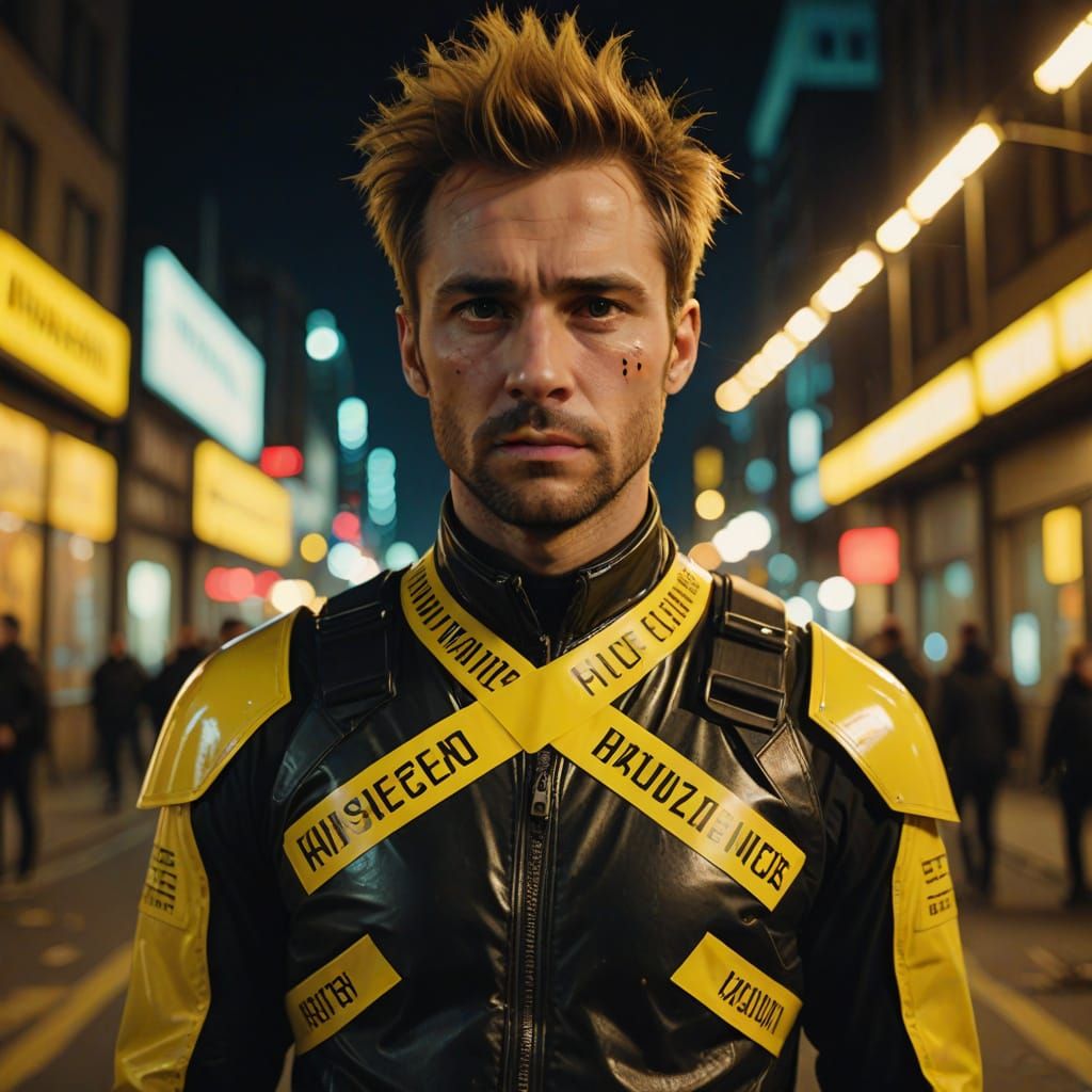 A hyperrealistic shot of a Russian superhero in a yellow and black costume. The vivid colors, dynamic lighting and shallow depth of field create an atmospheric, cinematic feel.