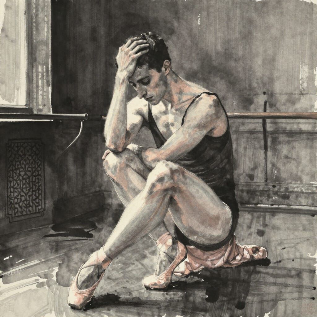 This image shows a solitary ballet dancer in a dimly lit studio, depicted with dramatic chiaroscuro lighting. The style blends ink wash painting with Art Deco elegance, featuring muted colors and deep shadows for a contemplative mood.