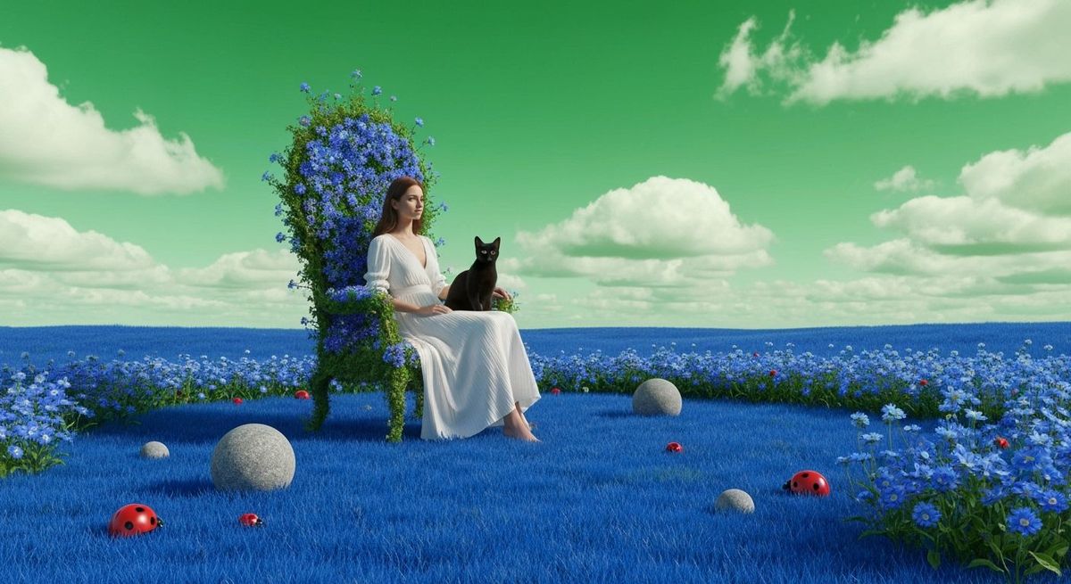 This image shows a woman and black cat seated on an ornate floral chair. A vast landscape with blue grass, blue flowers, and a green sky unfolds behind them, rendered with photorealistic detail and cinematic lighting.