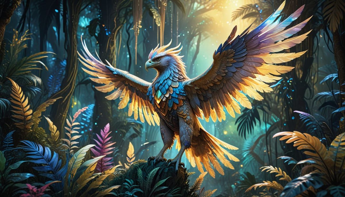 A watercolor of a griffin flying over a jungle. The feathers shimmer with iridescent light, and the jungle has bioluminescent flora. The image is fantasy concept art.