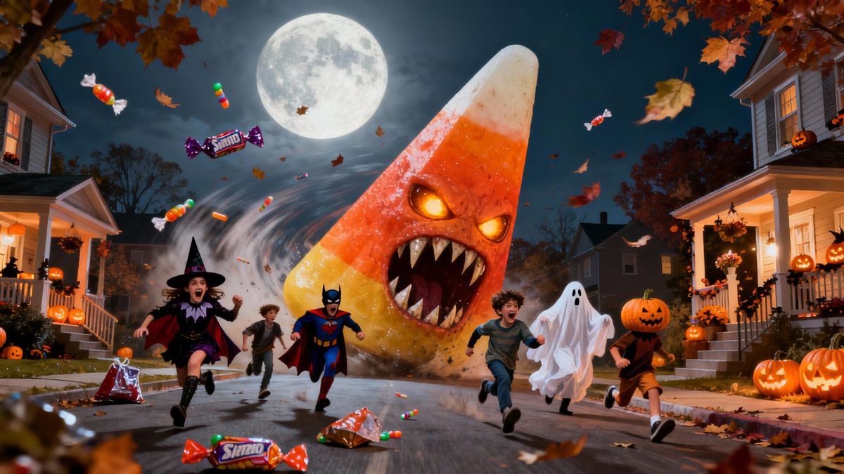 This image shows a giant, menacing candy corn with glowing eyes and sharp teeth terrorizing children on a suburban street. Cinematic lighting and a horror-comedy style enhance the dramatic scene.