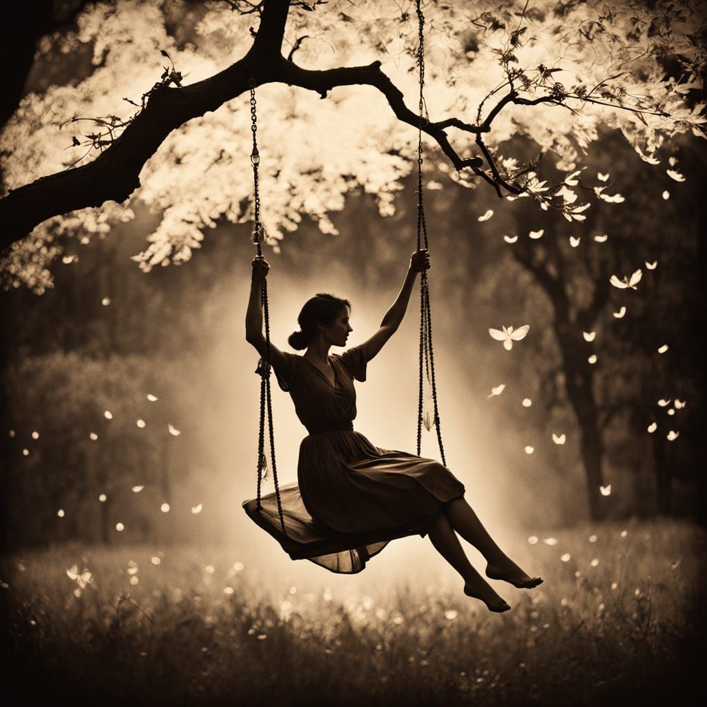 This image shows a girl on a swing under a silhouetted tree, captured with vintage film photography techniques. The scene glows with vibrant fireflies and warm sepia tones, reminiscent of documentary-style fine art.