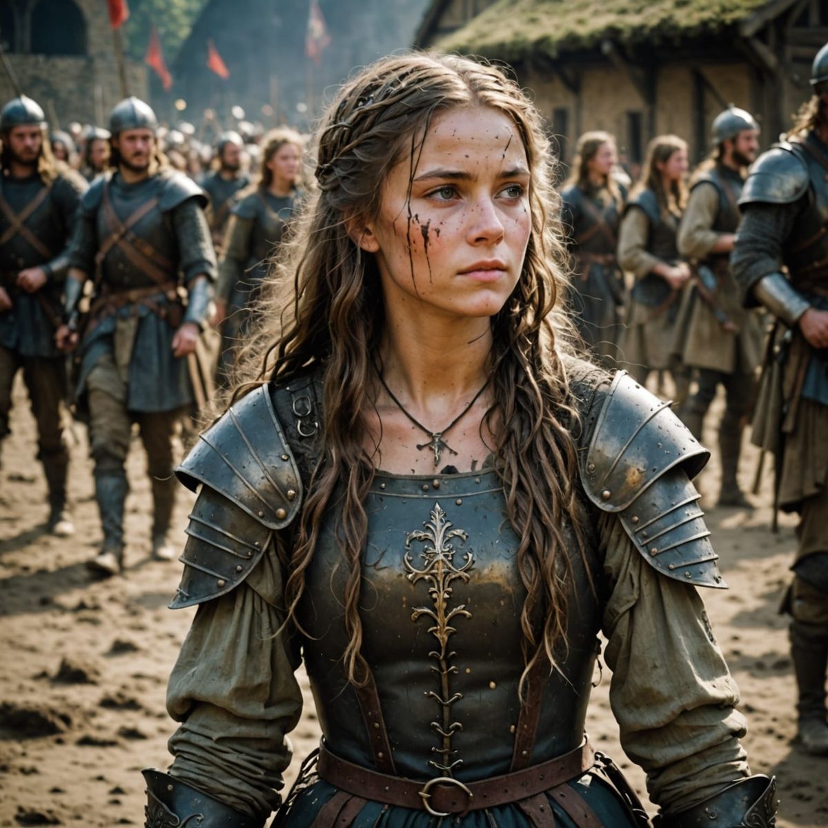 This image shows a young woman, around 15, in torn fatigues and covered in mud. It evokes a medieval setting, portraying a resilient character with a wild appearance.