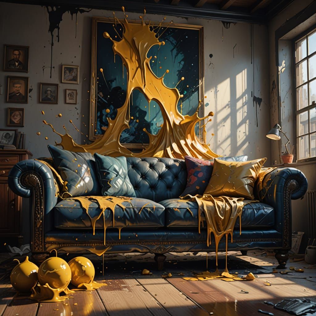 A close-up of a man vandalizing a sofa with paint in a low-angle shot, showcasing thick, heavy brushstrokes and vivid colors in an oil on canvas style with 3ds Max detailing, set against warm, golden lighting with deep shadows.