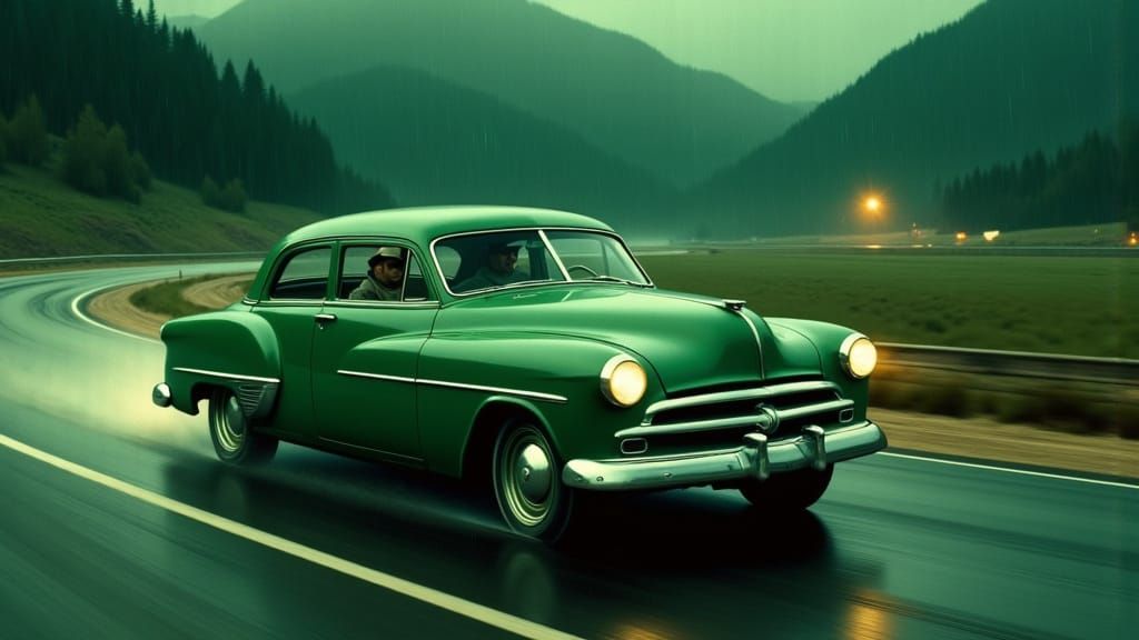 <lora:Style Randomizer:1.0> <lora:Raster:1.0> <lora:Sword and Sorcery 2:1.0> Medium shot. A green cast to the overall picture. A green 1950 Hudson Hornet iin an auto race on a short track with high banking turns. The car negotiates high on the final turn. The car is moving towards the camera. Rain, ...