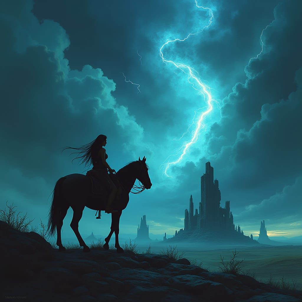 This image shows a lone Native American woman on horseback silhouetted against a dramatic, stormy sky and desolate landscape with ruins, in a dark fantasy comic art style.
