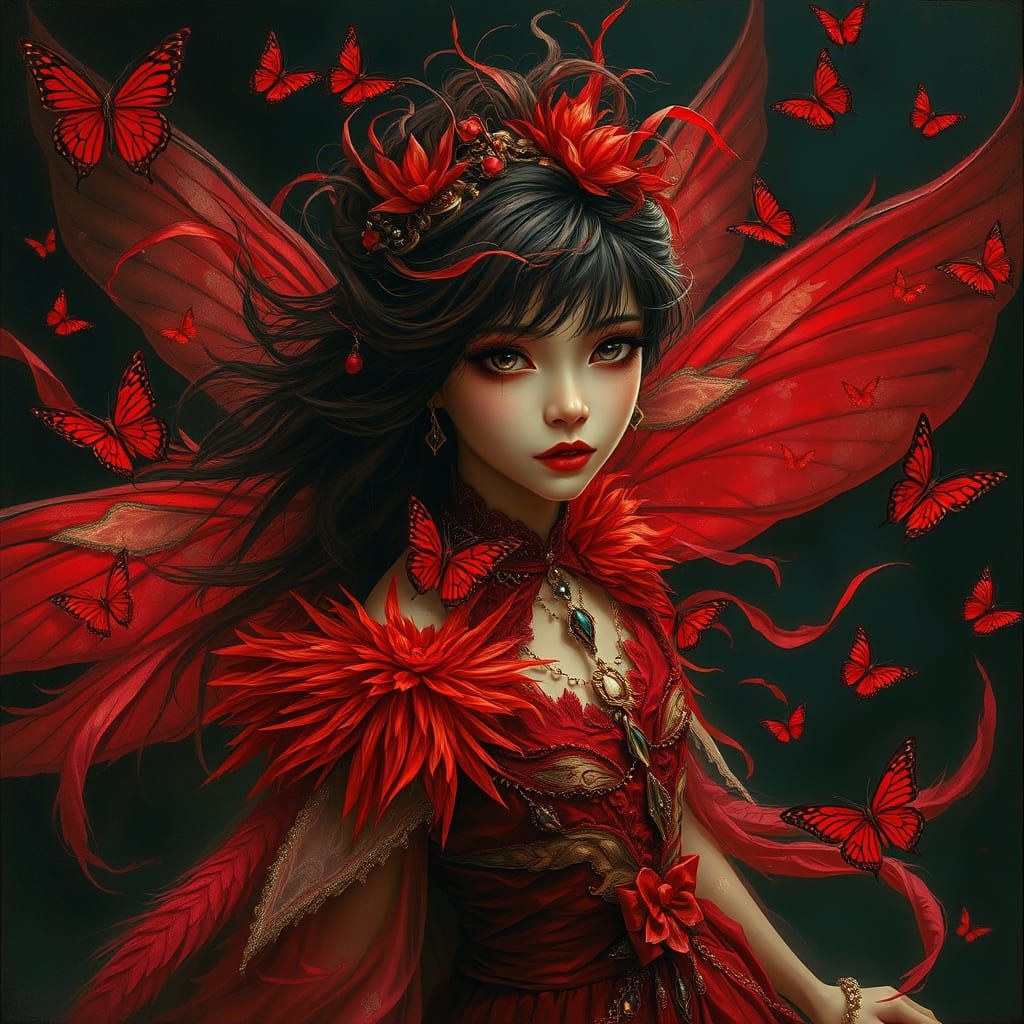 oil and airbrush portrait of a dark-haired adult fairy with intense eyes, all around her and incorporated into her dress and hair are rags, feathers, jewels, butterflies, all in shades of red and filling the picture, dark bg