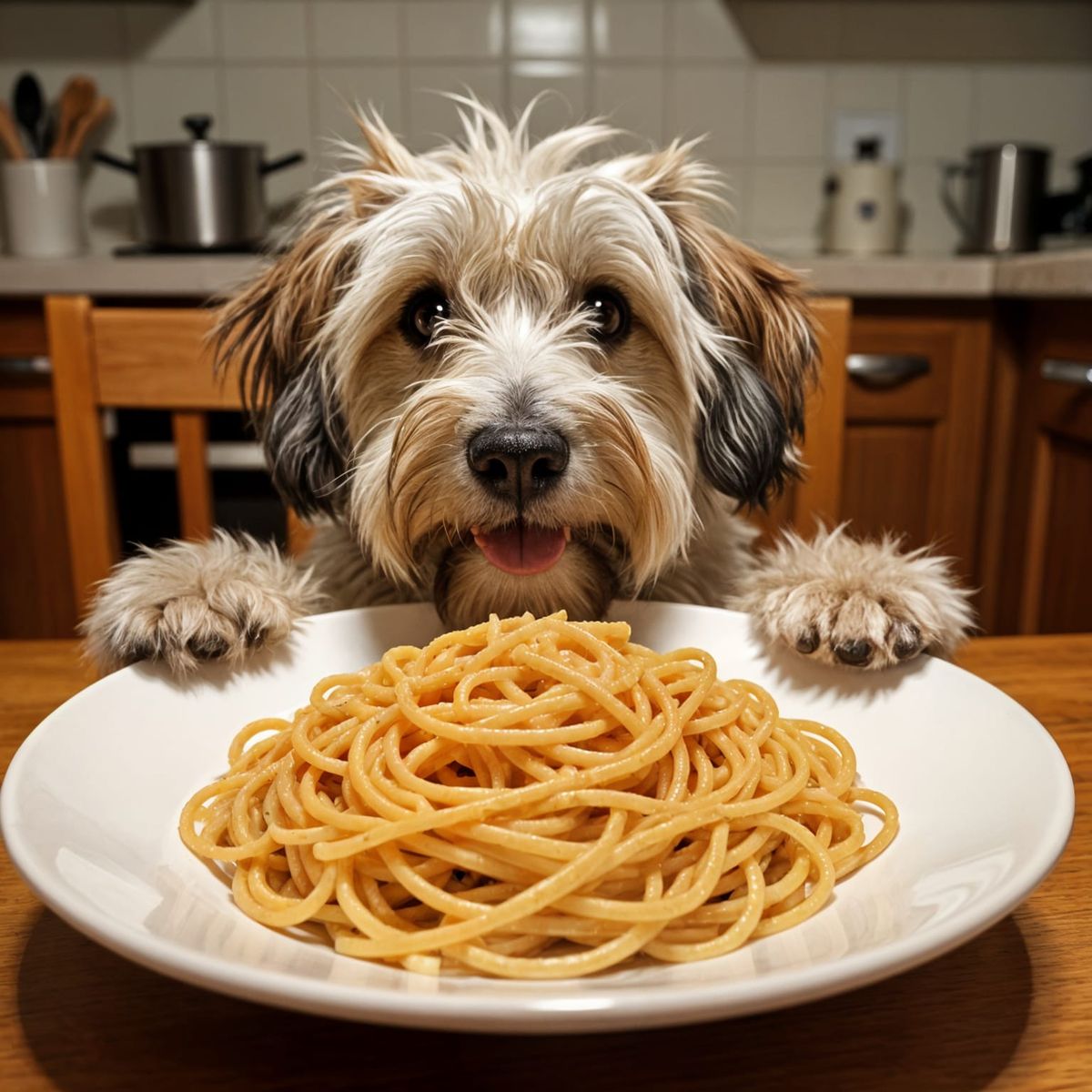 A funny image of a shaggy dog taking a selfie with a plate of spaghetti. The dog appears hungry and eager to eat the spaghetti, creating a humorous scene.