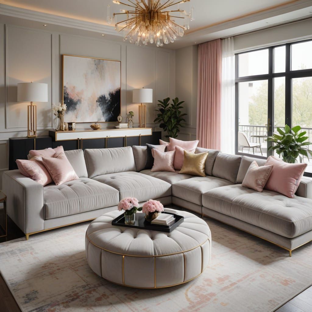A luxurious modern living room interior featuring a light gray sectional sofa. The image showcases a glam style with metallic accents, soft golden lighting, and a warm color scheme in 4k resolution.