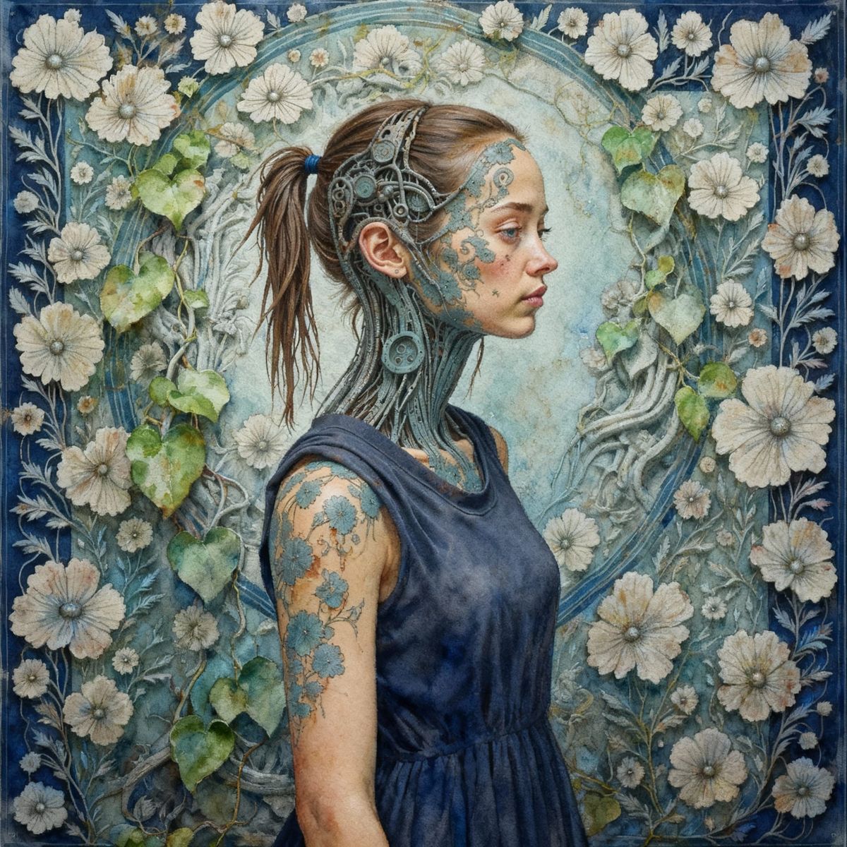 A full palette watercolour front-quarter profile of a young cyborg woman (floral pattern indigo tattoos; dark indigo sundress; corroded biomechanical elements) standing in front of an elaborate high-relief carving of flowering kudzu. Intricate details; proper anatomy; serene expression; gradient indigo/dark-indigo ...