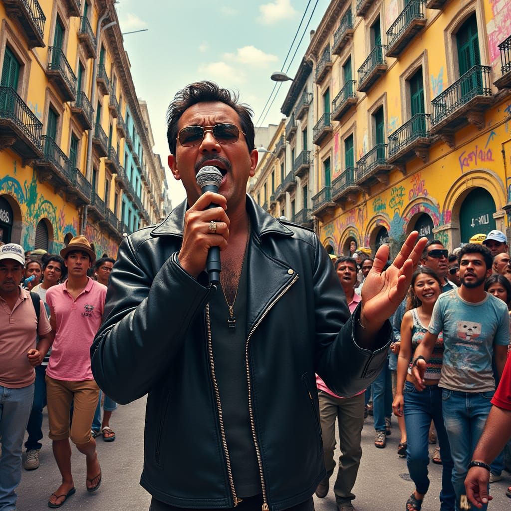 A Cuban protest singer with a microphone in a graffiti-covered street, surrounded by protesters. The image features bold lines and bright colors, inspired by street art masters.