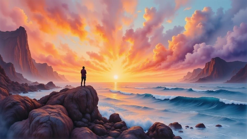 This image shows a lone figure on a cliff watching a dramatic sunset over a vast ocean. The scene is painted in a loose, expressive watercolor impressionist style with visible brushstrokes and bleeding colors.