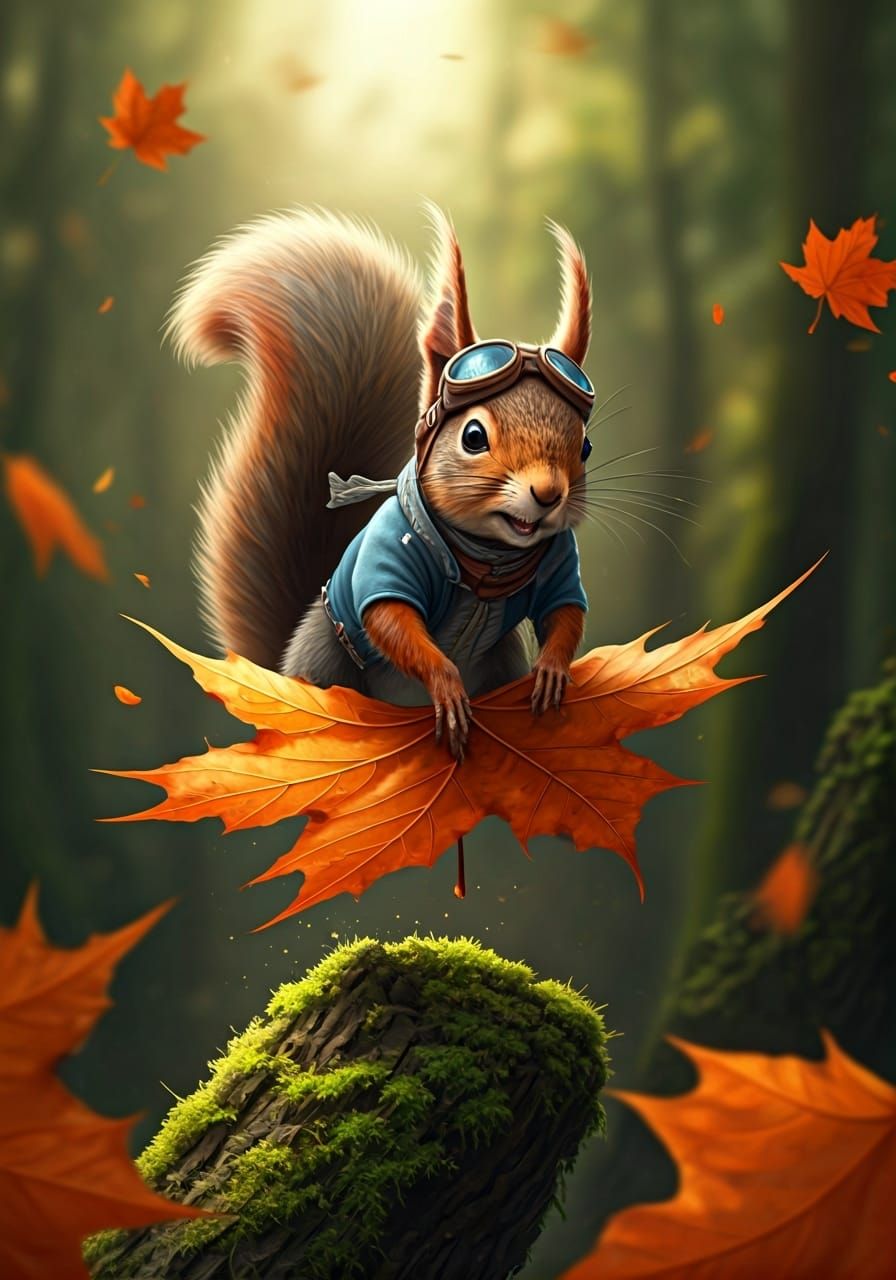 A dynamic image of a squirrel gliding through the air on a maple leaf, wearing aviator goggles. The vibrant autumn scene is rendered with painterly textures and golden light, in a naturalist action illustration style.