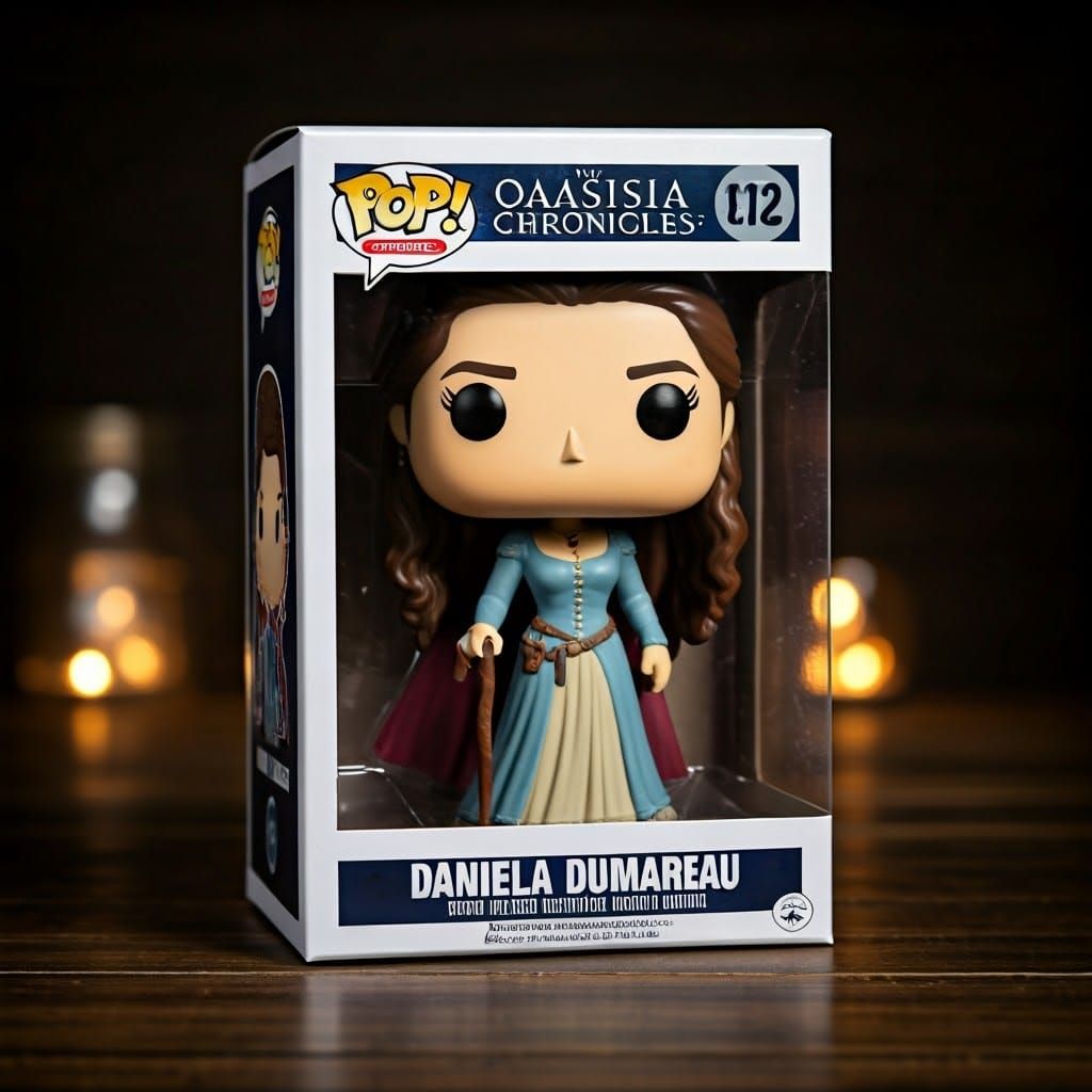 This image features a Funko Pop-inspired figurine of a dark-haired woman in medieval peasant attire, wrapped in a crimson shawl, holding a walking stick. Shot in professional photography style with bokeh and natural lighting.