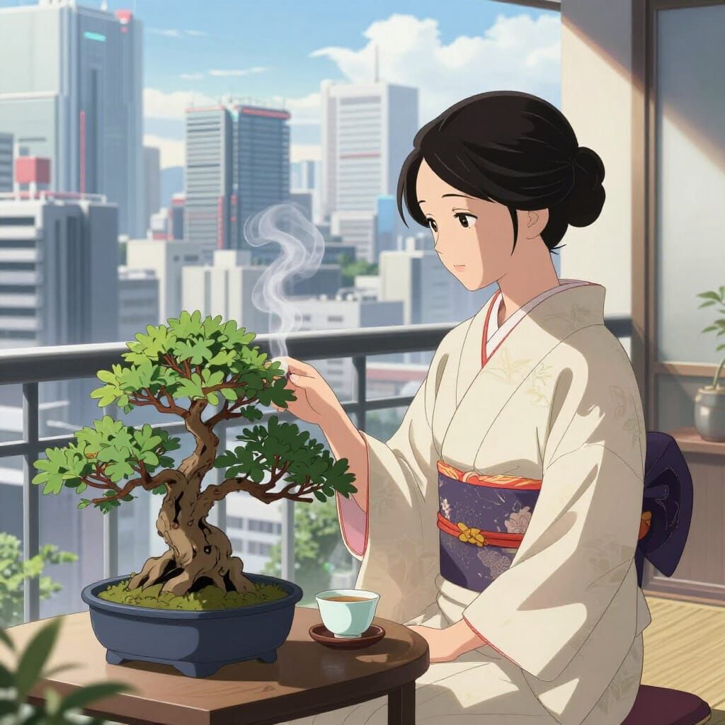 This image shows a tranquil woman in a kimono caring for a bonsai on a balcony. A futuristic city skyline is visible, with steam rising from a teacup. The art style is inspired by anime key visuals, featuring soft light and detailed imagery.