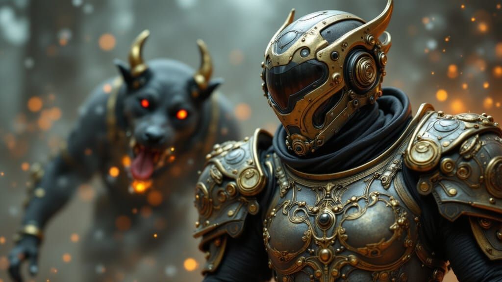 A hyperdetailed portrait of space templars in gold accented armor, battling werewolf-like creatures. This 8K resolution concept art features dynamic, triadic lighting in an art nouveau aesthetic.