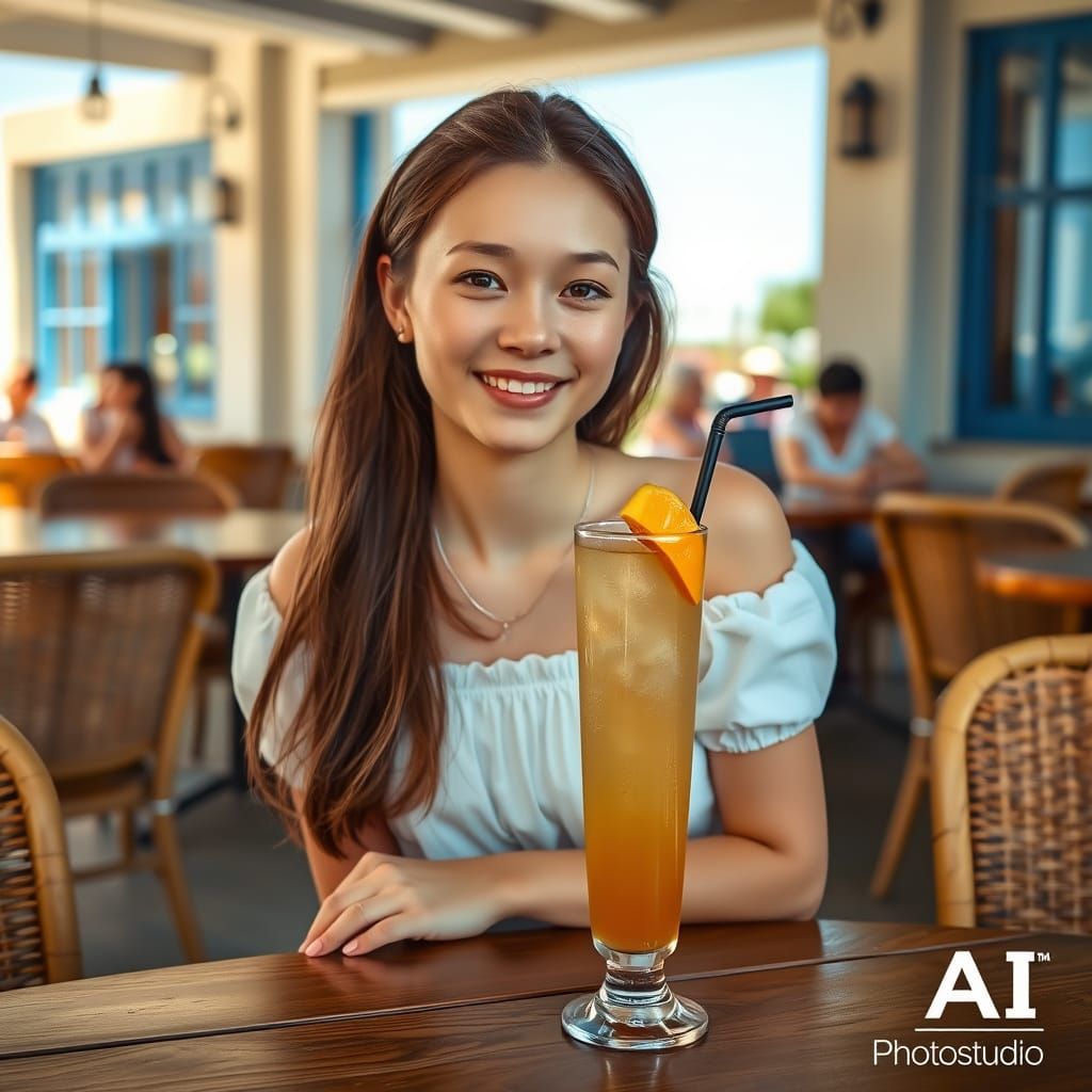She does not pose — she is. A breeze has settled in her smile, and the sun has found a mirror in her eyes. She drinks life in long, citrus-colored sips, without hurry, without mask. There is no artifice here — only warmth. She is not the center of the world, but a place where the world pauses to breathe. Even the straw seems to bend toward her presence. She holds no secret, no drama — only the sacredness of now. And somehow, that is more than enough.