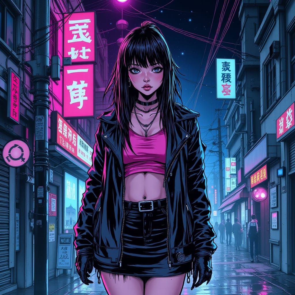A distressed young woman stands on a lonely Tokyo street at night, bathed in neon light. Her sad expression and club-goer fashion evoke a dramatic, cinematic feel.