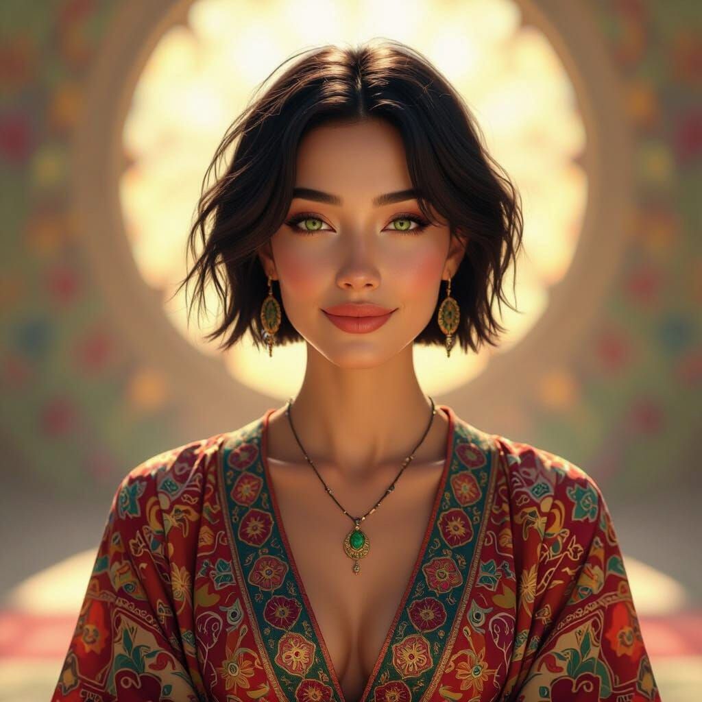 A striking picture of a Latina woman with green eyes and short black hair, smiling serenely in warm sunlight. The portrait features vibrant clothing and a highly illuminated background, as a hyperrealistic digital painting.