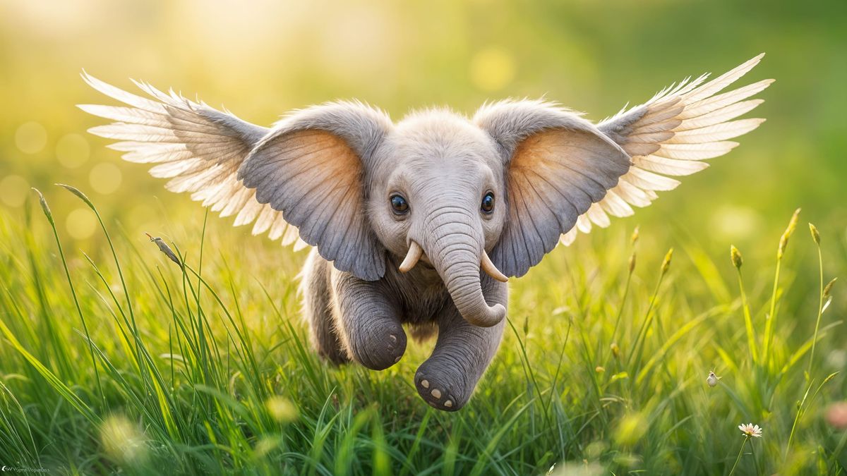 This image shows a small, fluffy pink elephant soaring over a green field. Eagle wings carry the adorable creature, with ivory and pink feathers fluttering in the wind under a warm sun.