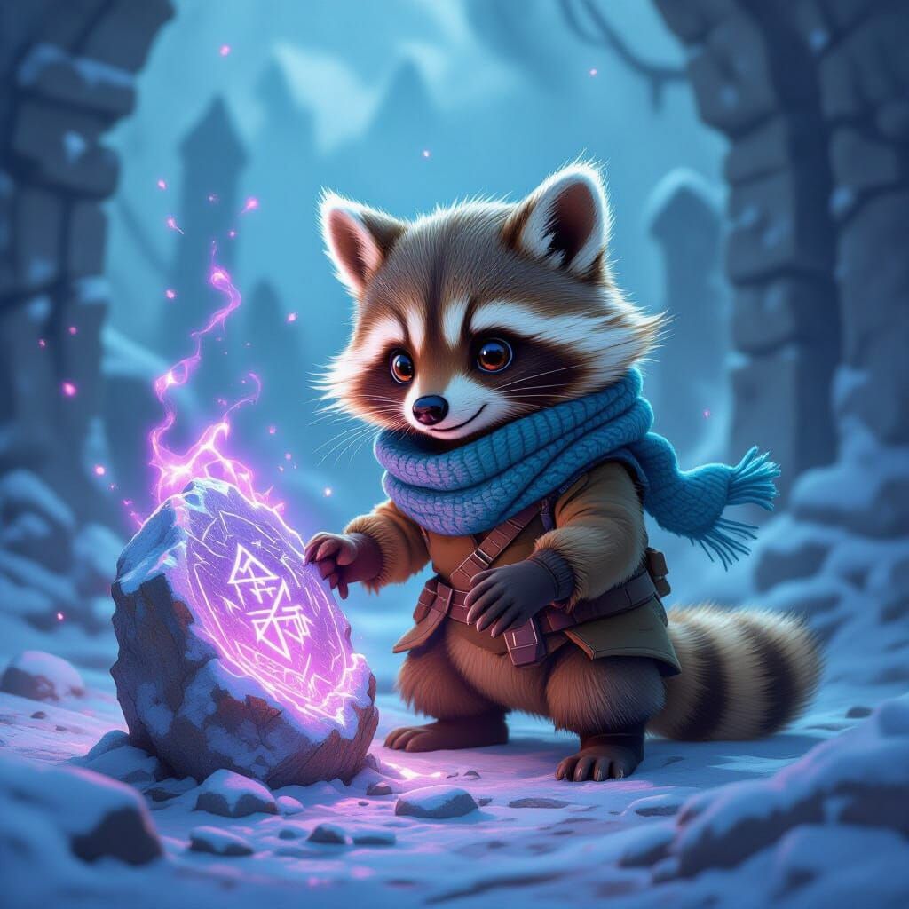 This image shows a furry, raccoon-like explorer examining a glowing rune in frostbitten ruins. The teal scarf contrasts against the violet energy emanating from the petrified wood. The scene is reminiscent of a nostalgic photograph.