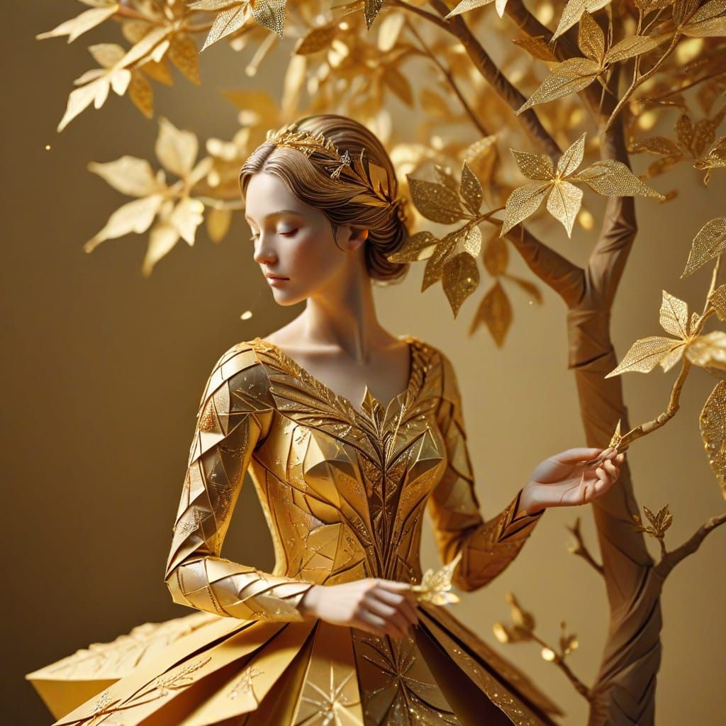 This image showcases a woman creating a golden tree from gold dust, rendered in a detailed papercraft style with intricate origami and pearl adornments. Soft, ethereal light fills the scene.