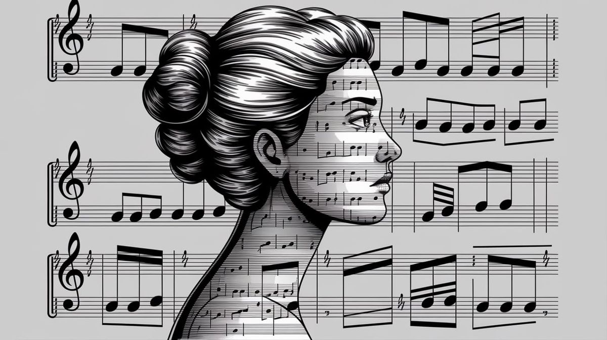 This striking image features a profile portrait of a woman constructed entirely from musical notes, rendered in a detailed, minimalist black and white ink style reminiscent of op art and abstract sculpture.