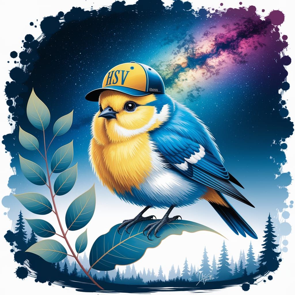 A vibrant image of a small blue bird wearing a yellow cap with "HSV" in blue. The bird, resembling a canary, sits on a eucalyptus leaf under a starry sky, depicted as alcohol ink art.