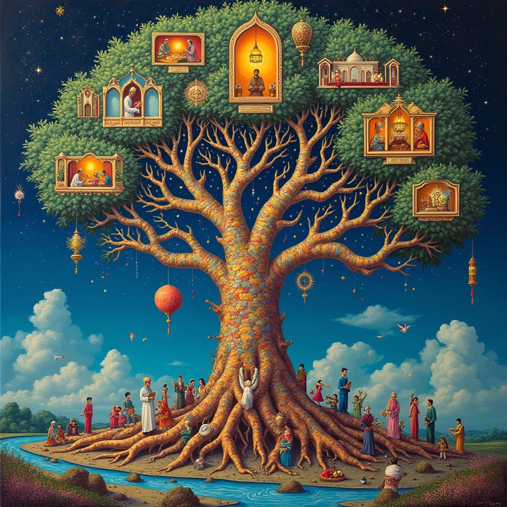 This image shows a surreal tree symbolizing Ramadan and Islamic faith. The vibrant, geometric patterns and scenes of worship, charity, and learning embody the holy month, set against a diverse community celebrating Eid al-Fitr.