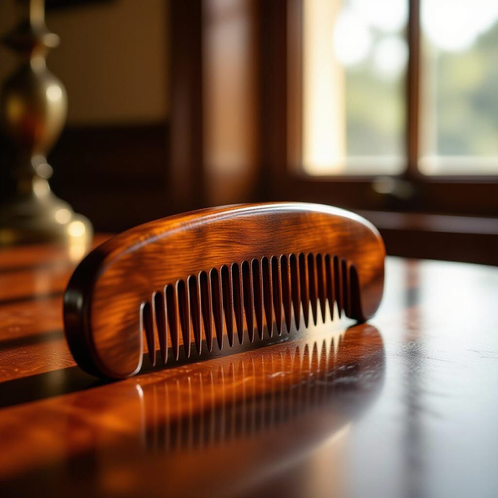 A luxurious, vintage wooden comb with intricate carvings sits on a polished mahogany table. Soft light highlights aged details, captured in sharp focus with a shallow depth of field.