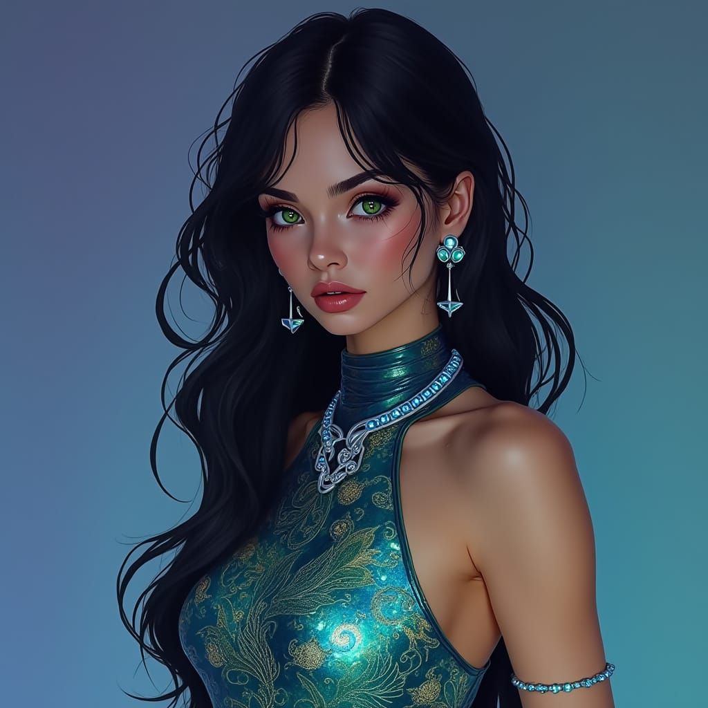 This image shows a stunning woman with piercing green eyes and vibrant, intricately embroidered clothing, set against a subtle gradient background, in a futuristic style blending sleek metallic lines and glowing neon accents with hyperrealistic digital art.