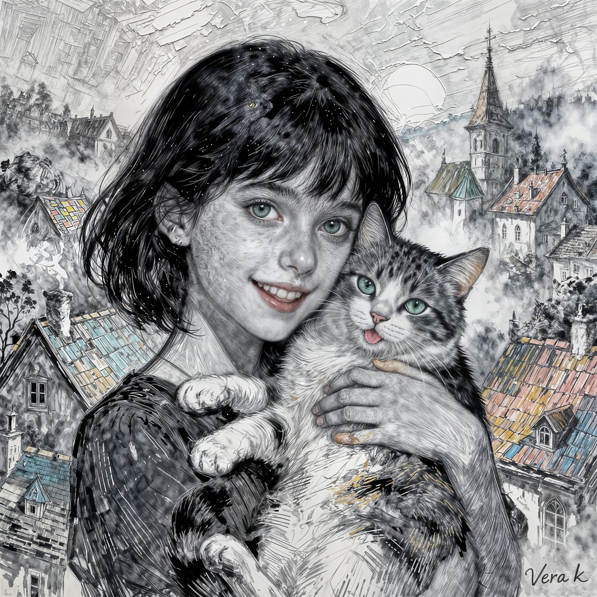 This image showcases a girl with black hair embracing a cat, rendered in the distinct colored grattage technique. Soft colors and intricate lines create a detailed, ethereal scene.