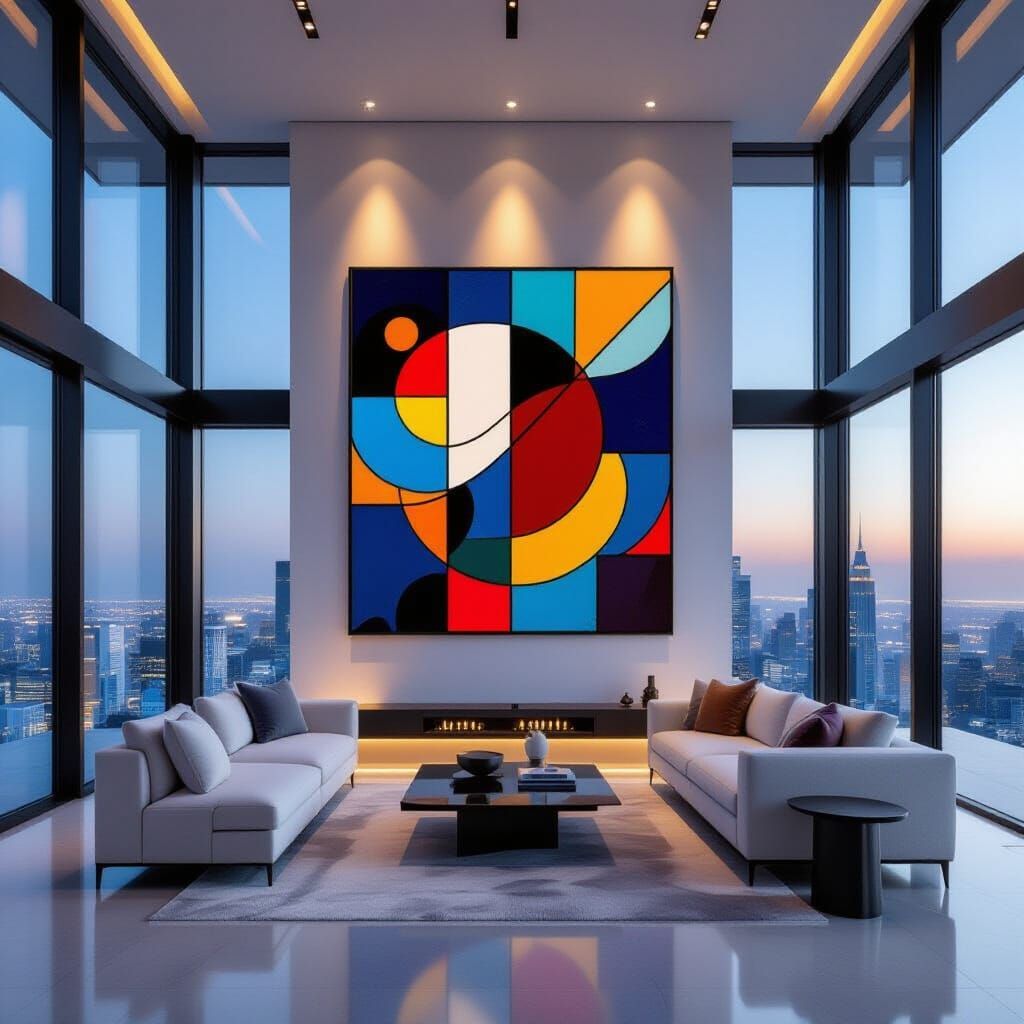 This image features an abstract painting with geometric shapes and dynamic lines in blue, grey, maroon, and tan. It hangs in a luxurious, ultra-modern living room with large glass windows and city views.
