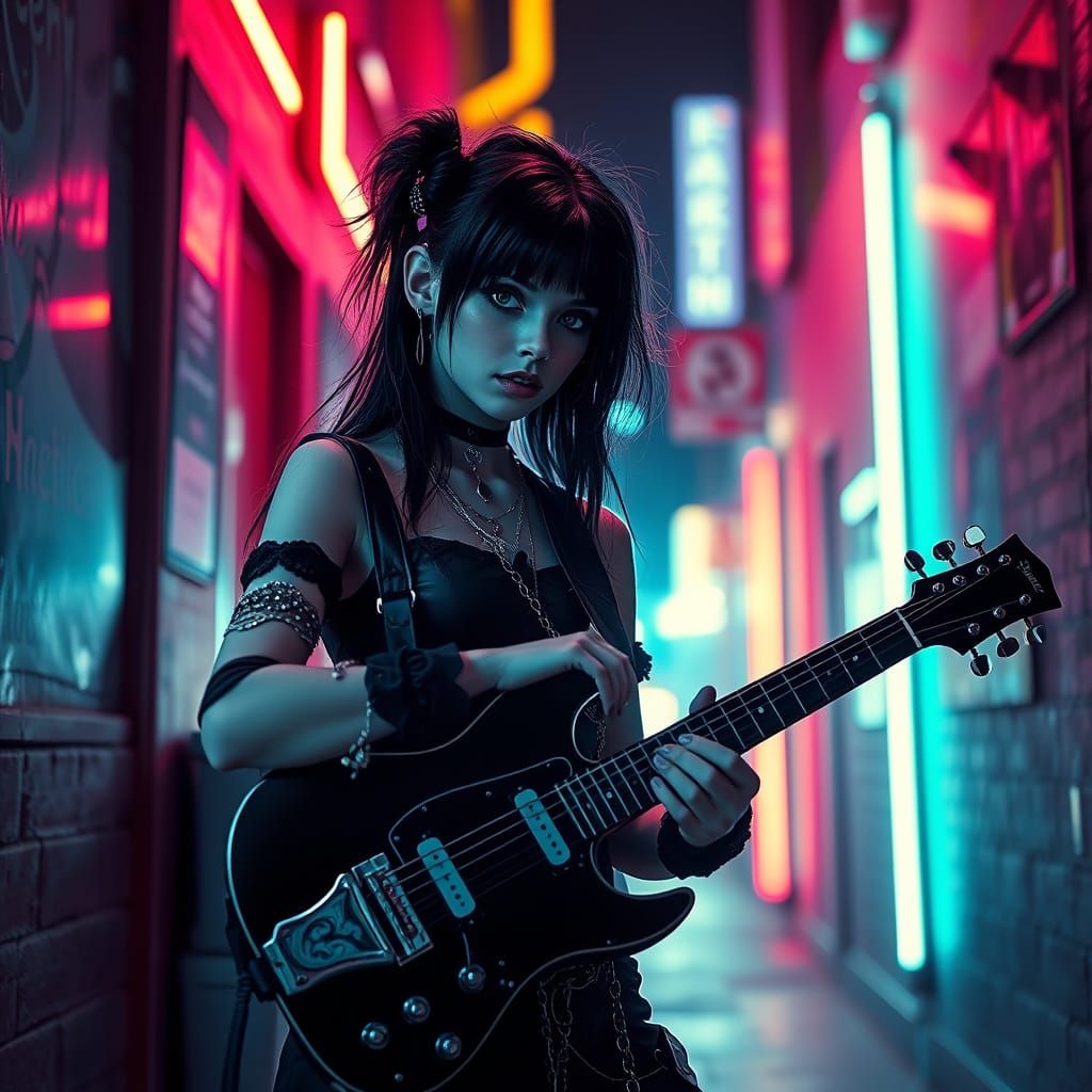 A digital art portrait of a goth girl with striking features playing guitar in an alley. The portrait features vibrant colors, bold lines and dynamic lighting in a cyberpunk aesthetic.