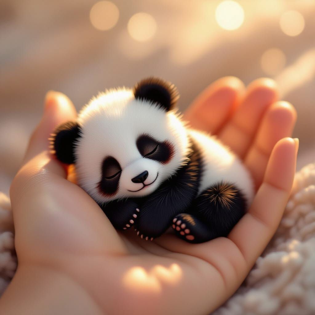 This image shows a miniature panda pet sleeping on a hand. It features realistic fur, delicate shading, and a gentle bokeh background, created in a detailed digital art style.