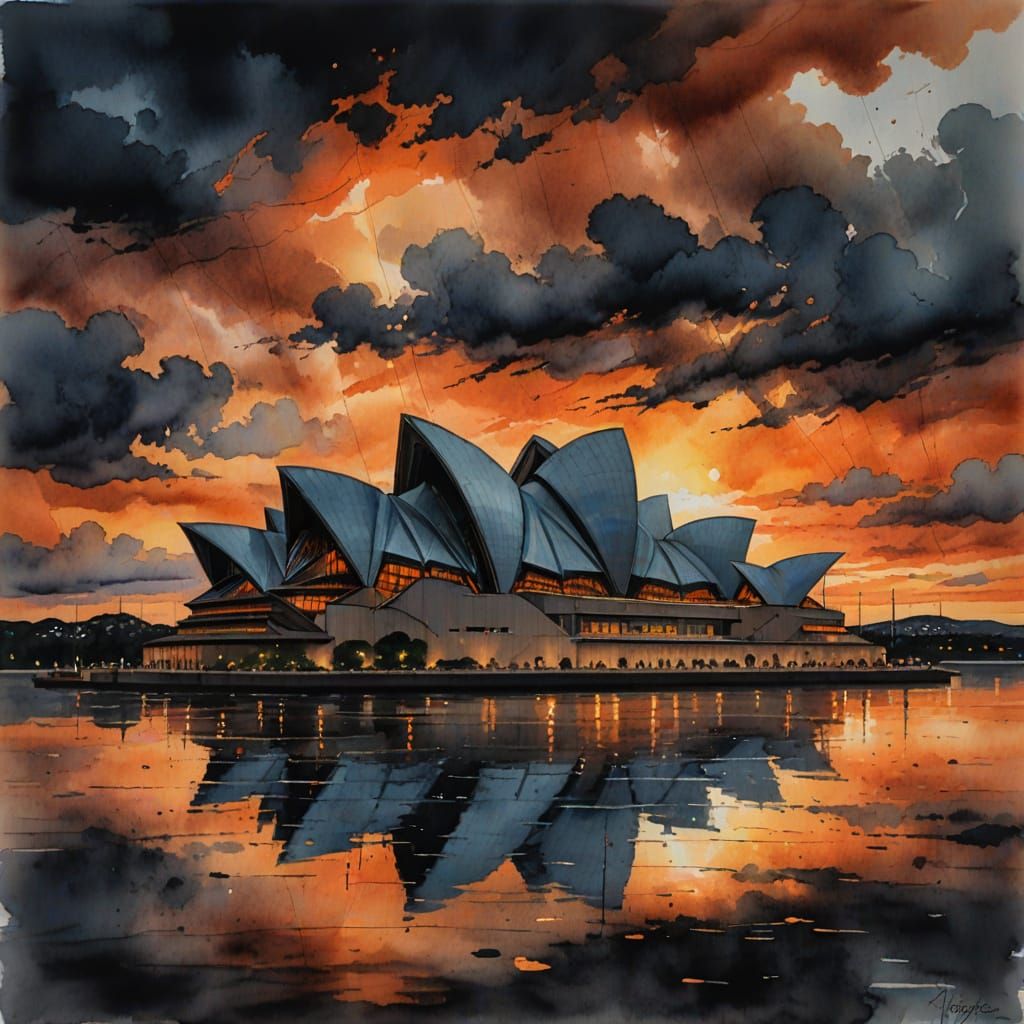 A watercolor painting of the Sydney Opera House at sunset. The image features expressive brushstrokes, soft color blending, and dark, ominous clouds contrasting with warm orange hues.