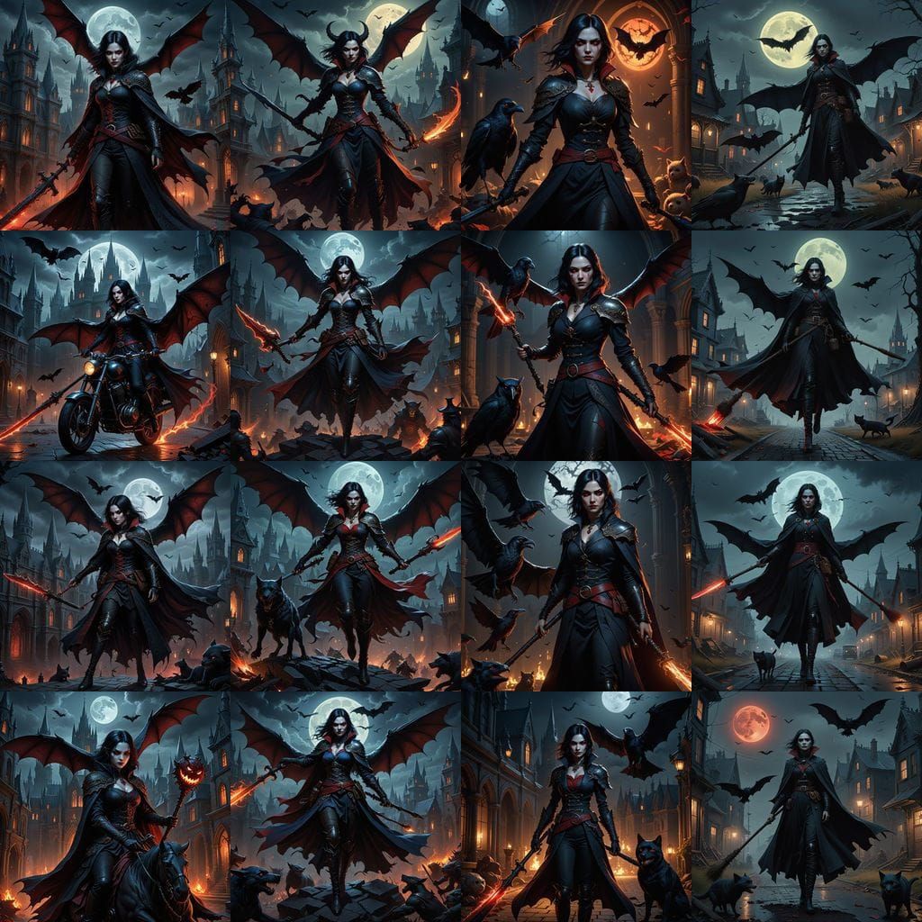 This image shows a stunning female vampire with raven hair and glowing red eyes, wielding a rapier and riding a flying broom, surrounded by intricate fantasy details and vibrant colors, reminiscent of high-end concept art.