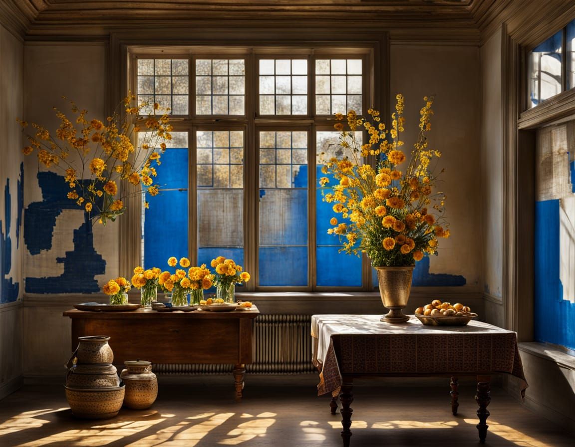 % && Old butcher Table by a large bright window bundles of arranged Dry flowers golden and delft blue in a dimpled copper bucket whitewashed walls contre-jour god rays radiant rays Jackson Pollock Vermeer striking hyper real painting atmospherics