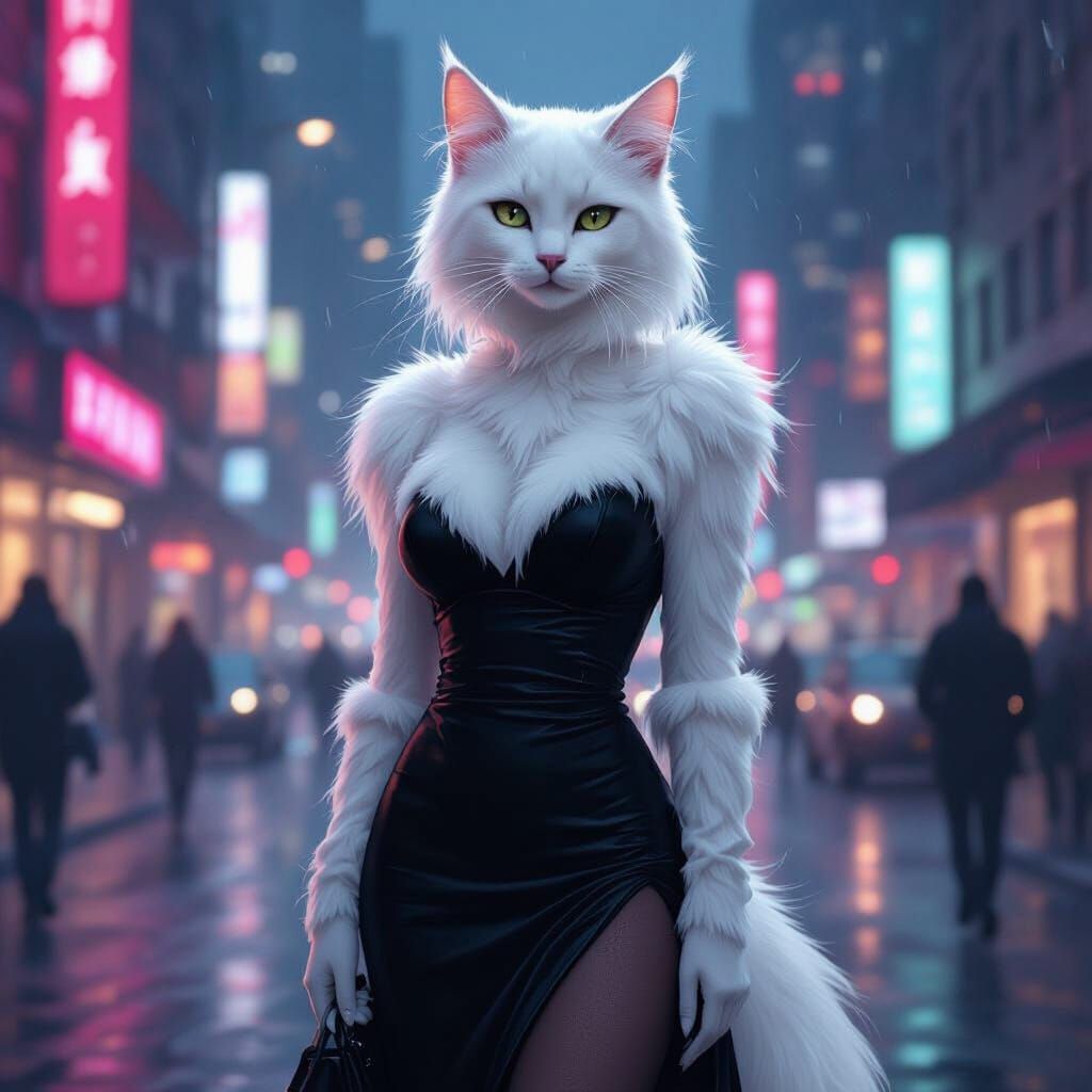 This image shows a white feline furry in a black dress and pantyhose, standing in a vibrant nighttime city. The artwork blends cyberpunk with neon noir aesthetics.